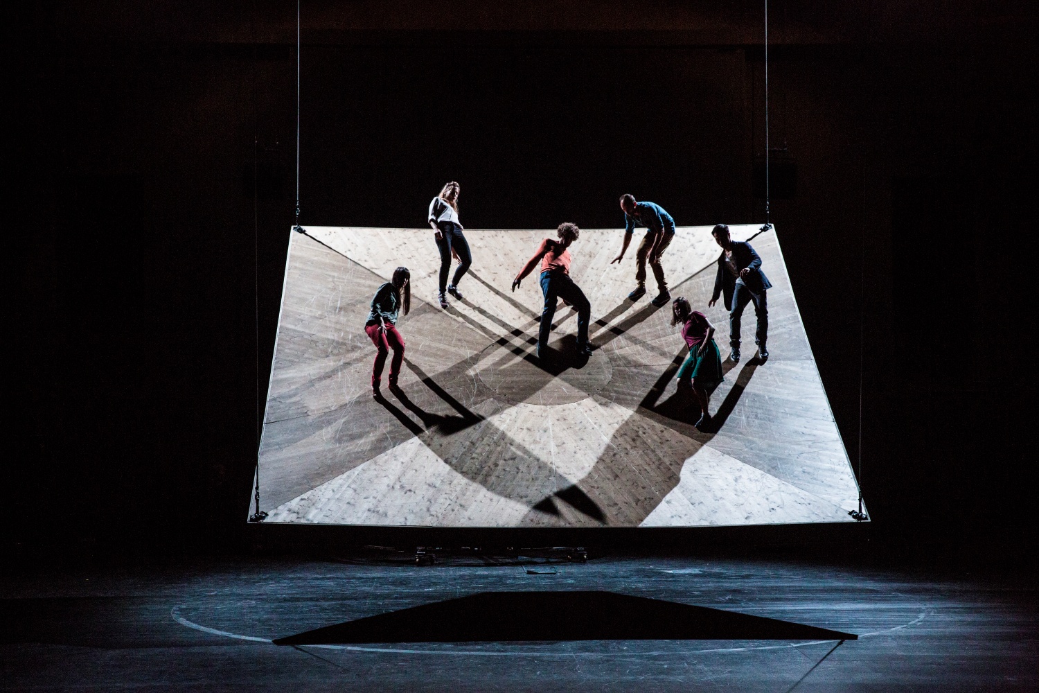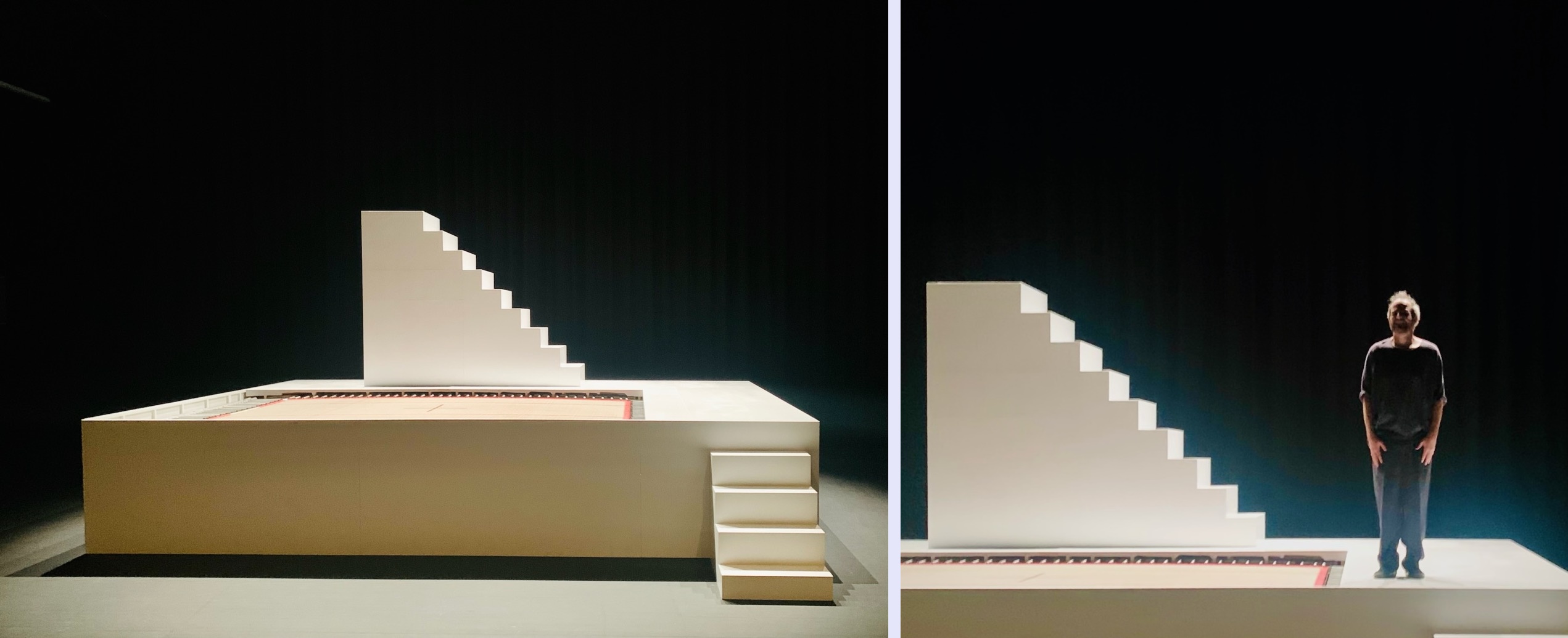 블랙 배경의 화이트 계단과 트램펄린 무대에서