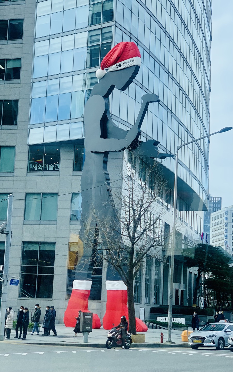 산타 모자와 양말을 쓴 'Hammering Man'을 보았다^^